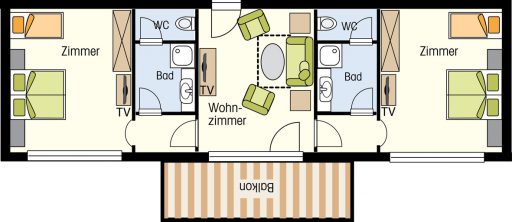 50m² für 2 bis 5 Personen, 1 Schlafzimmer, 1 Wohnzimmer (mit Schiebetür von Schlafzimmer trennbar) mit Schlafcouch (inklusiver zusätzlicher Matratzen für optimale Liegequalität)